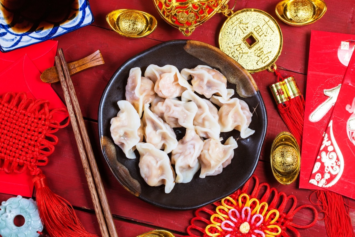 - Jiaozi is a popular dish for the Chinese New Year. They may be filled with meat, like beef, chicken, fish, pork, and shrimp. Or, they may be filled with vegetables, like cabbage, carrot, celery, green onion, mushroom, or spinach.