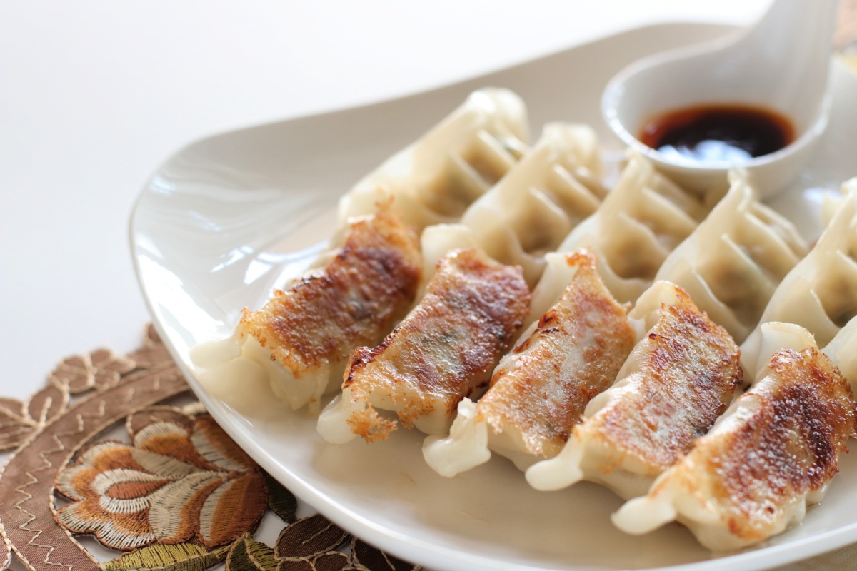 "Jiaozi" (JYOW-dzuh) are Chinese dumplings. The word means "dumpling" in Mandarin Chinese. A Chinese physician created them back in the Eastern Han Dynasty (25-220 CE), adding them to a warming broth to help heal frostbitten ears, so they earned the nickname "tender ears."