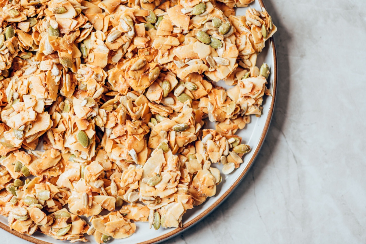 - In the 1960s and early 70s, granola was brought back by health-conscious young people or "hippies." They would often make their own granola. Possible dry ingredients were rolled oats, wheat germ, shredded coconut, dried fruit, nuts, and seeds. Those would be saturated with a heated syrup of honey or brown sugar, oil, water, vanilla, and salt. Then, the cereal would be spread out on baking sheets and baked at a low temperature, stirring every few minutes, until dry and golden brown.