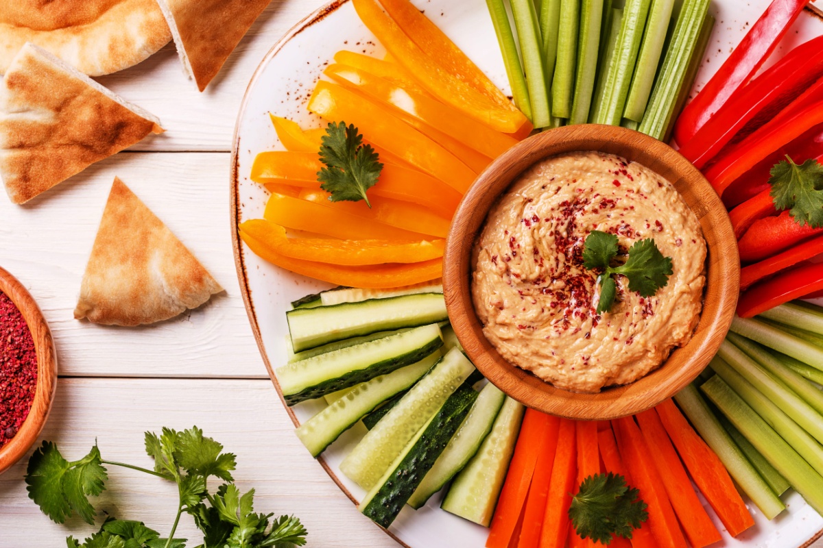 Slice 1 cucumber, 1 apple, 2 celery stalks, and 1 red bell pepper into bite-sized pieces. Arrange on a plate with a handful of baby carrots and toasted bread dippers and serve with Sweet and Savory Middle Eastern Hummus!