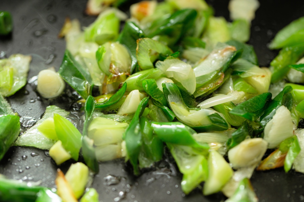 Adults fry the green onions until they’re crispy around the edges and charred in spots, about 1 to 2 minutes.