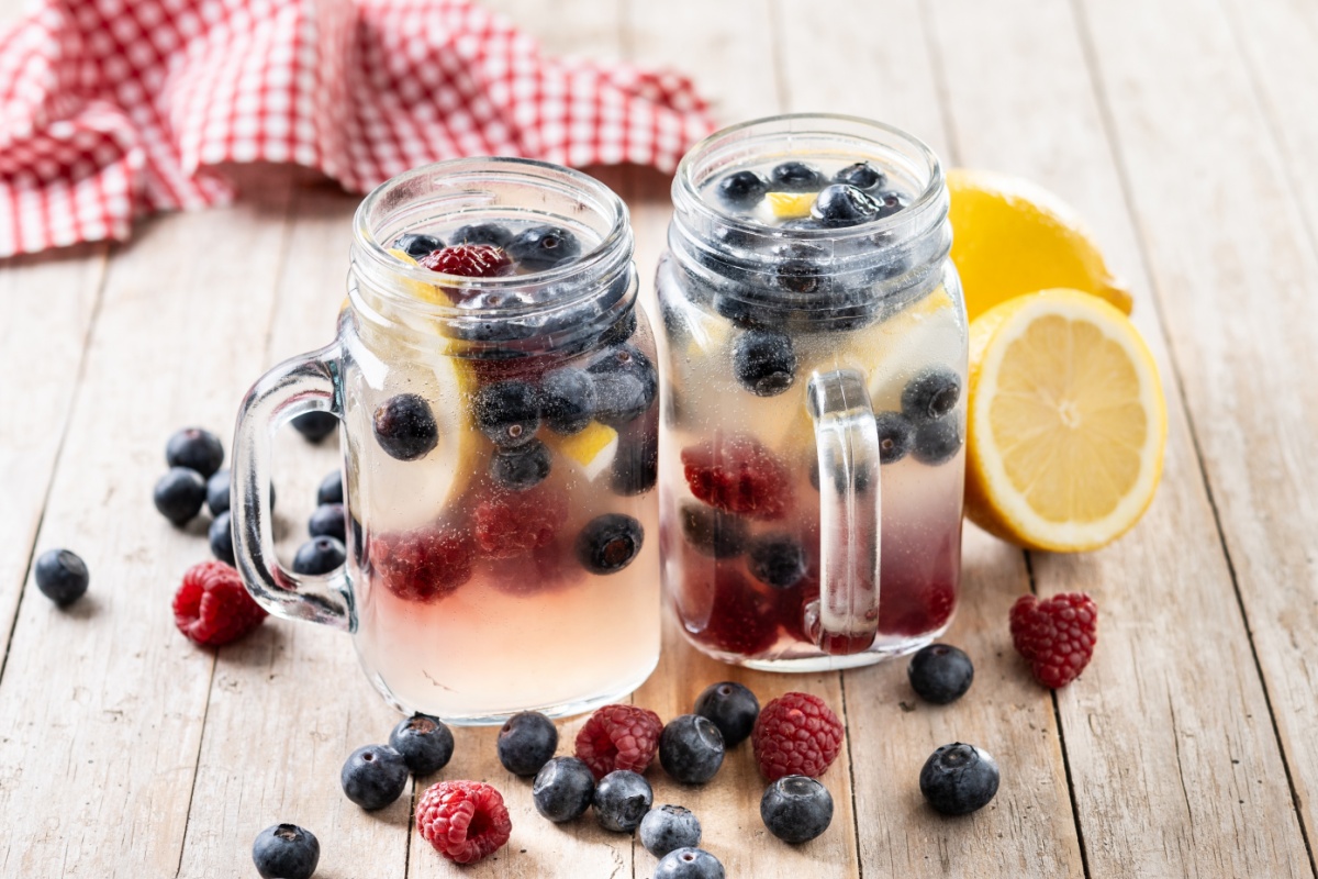 Squeeze the juice from 2 to 2 1/2 lemons into a drinking glass. Measure and add 1 handful of fresh or frozen and thawed berries. Use a metal fork or spoon to mash the berries against the side of the glass.
