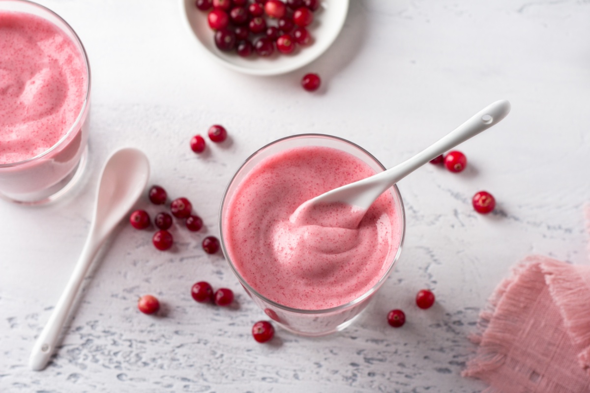 Looking for a bright, cold-weather pick-me-up? This rosy-pink treat blends tart yogurt and cranberries with powdered sugar into a sweet, creamy frosty that refreshes without feeling heavy.
