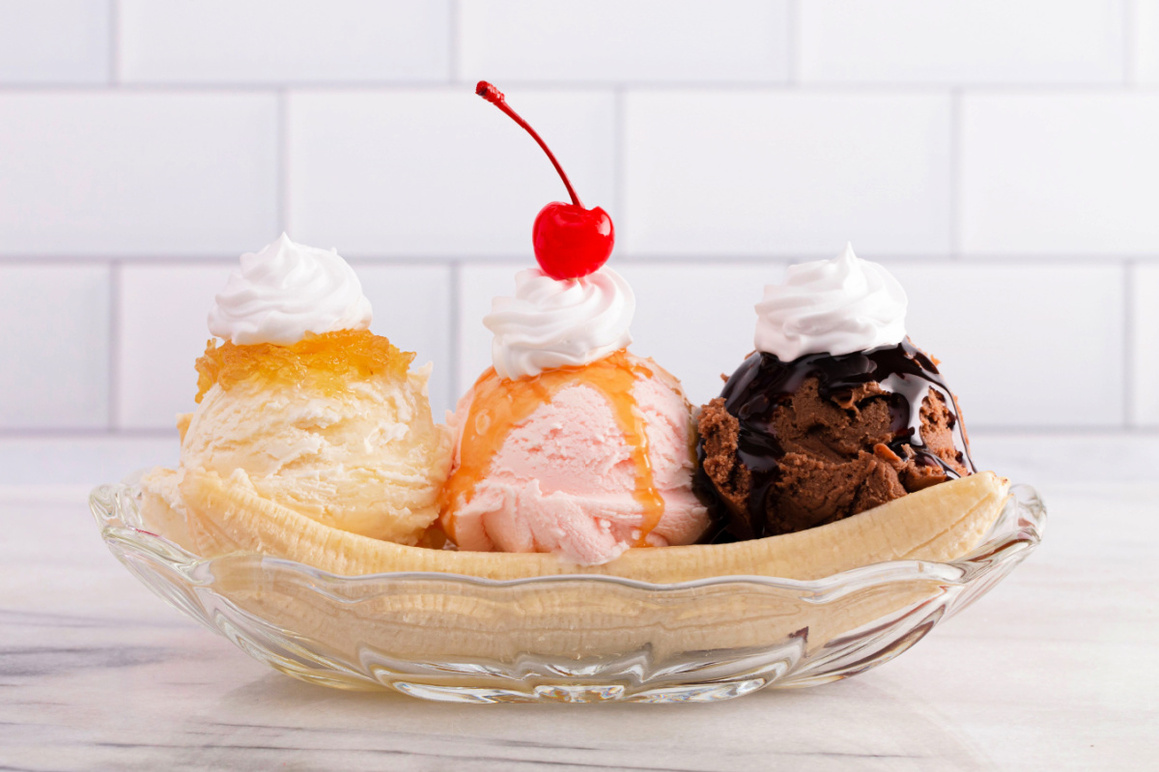 - Why the fuss about who gets the honor of being the birthplace of the banana split? Well, it is just one of the most ideal and delicious (and filling) desserts there is! Served in a long glass dessert dish called a "boat," it is made with a peeled banana, split in half vertically, with three scoops of any flavor of ice cream (a combo of chocolate, strawberry, and vanilla are classic), and topped with one or more sauces (like caramel, chocolate, pineapple, and strawberry), whipped cream, and maraschino cherries. Chopped nuts can also be added.