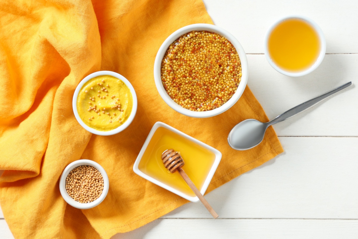- There are several varieties of mustard. The most common variety in the United States is classic yellow mustard, introduced in 1904 by George J. French at the World's Fair in St. Louis, where it was served on hot dogs. It was originally known as "cream salad mustard." Yellow mustard is made from less spicy yellow mustard seeds with more vinegar. Its bright yellow color is due to added turmeric. Yellow mustard is popular on hot dogs, hamburgers, and pretzels, as well as in barbecue sauces and potato salad.