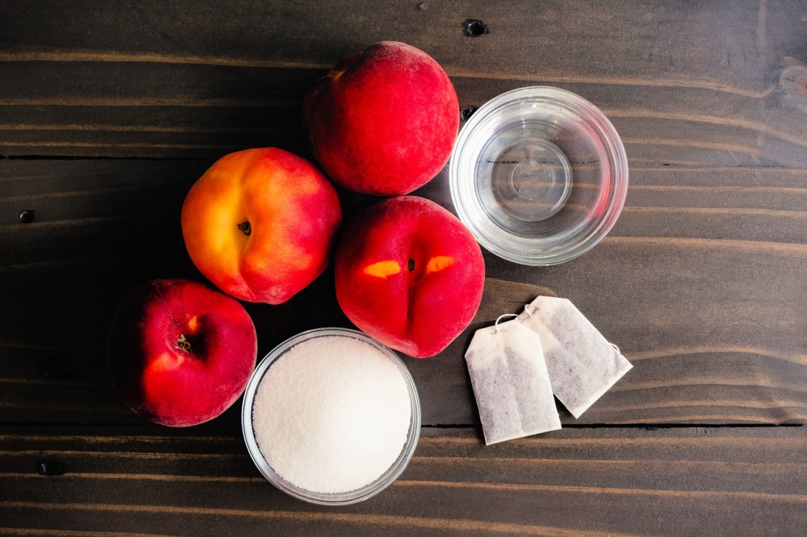 - To make the tea, peeled peach slices are simmered with sugar to create a peach syrup. Ripe peaches are sweeter, so sugar amounts may vary. The peaches and syrup are added to steeped black tea and chilled.