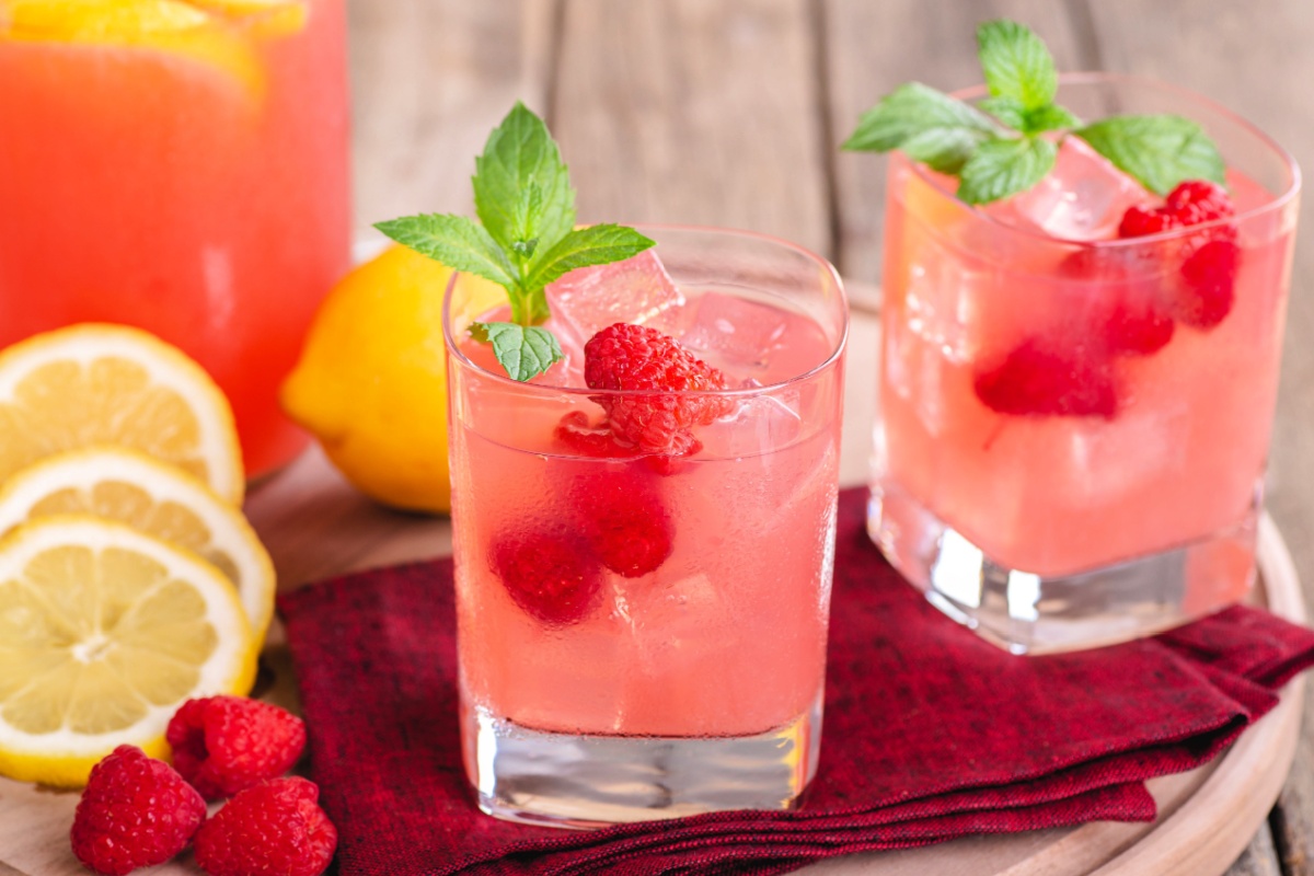 The light pink hue of this fresh raspberry lemonade makes it a standout at any gathering!