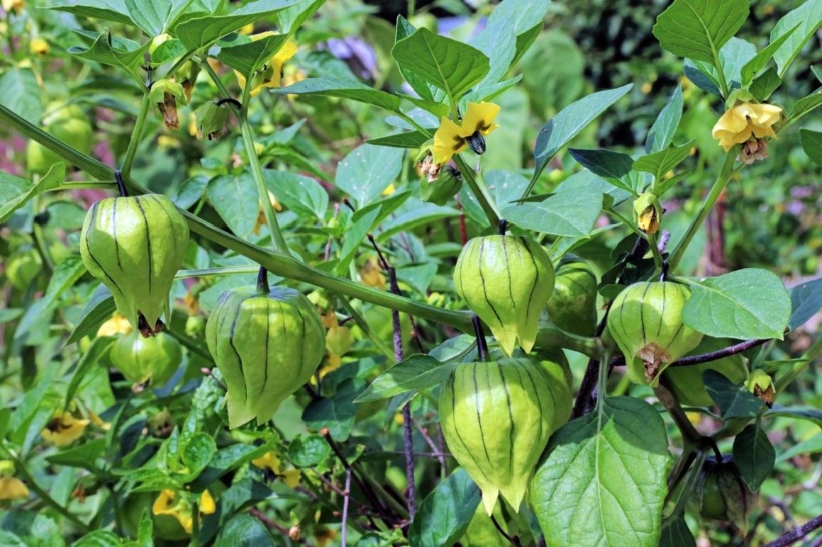 - The leaf-like sepal at the base of the flower expands around the developing fruit, forming the husk, which surrounds the fruit as it grows. The fruit is a green spherical shape, 1 to 3 inches in diameter. Some varieties may be yellow or purple when ripe.