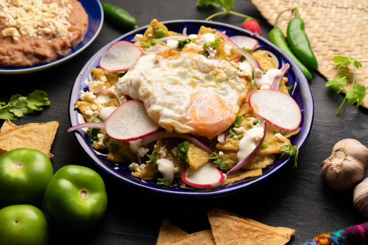 - To make chilaquiles, cut corn tortillas into triangles and fry them until crisp. The crisp tortilla chips are simmered in a green or red homemade or jarred salsa (or the salsa can be added before serving for crispier tortilla chips), then garnished with avocado, cheese, chicken (or other meat), cilantro, crema, chopped onions, a fried egg, or a combination. Eggs, guacamole, and refried beans may be served on the side.