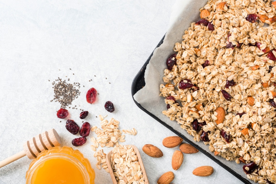 - In the 1960s and early 70s, granola was brought back by health-conscious young people or "hippies." They would often make their own granola. Possible dry ingredients were rolled oats, wheat germ, shredded coconut, dried fruit, nuts, and seeds. Those would be saturated with a heated syrup of honey or brown sugar, oil, water, vanilla, and salt. Then, the cereal would be spread out on baking sheets and baked at a low temperature, stirring every few minutes, until dry and golden brown.