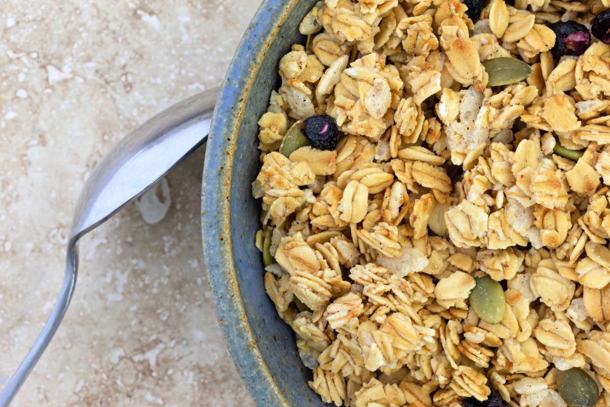 - Granola can be a healthy and filling breakfast food. The rolled oats, fruit, and nuts add fiber to the diet, and nuts and seeds add healthy fats and protein. Calories and sugar content can be high, so checking labels and limiting portion sizes is important.