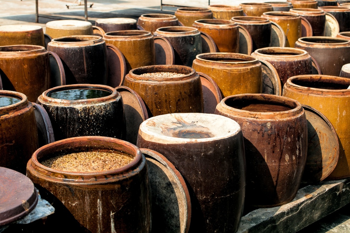 - The traditional way of making soy sauce takes months. The soybeans are first soaked in water and then boiled. Wheat is roasted and crushed and added to the boiled soybeans in equal amounts. Aspergillus fungus (either oryzae or sojae species) and brewer's yeast (Saccharomyces cerevisiae) are added. The cultured soybean and grain mixture is fermented and brewed using a wet method with salt brine or a dry method using coarse salt.